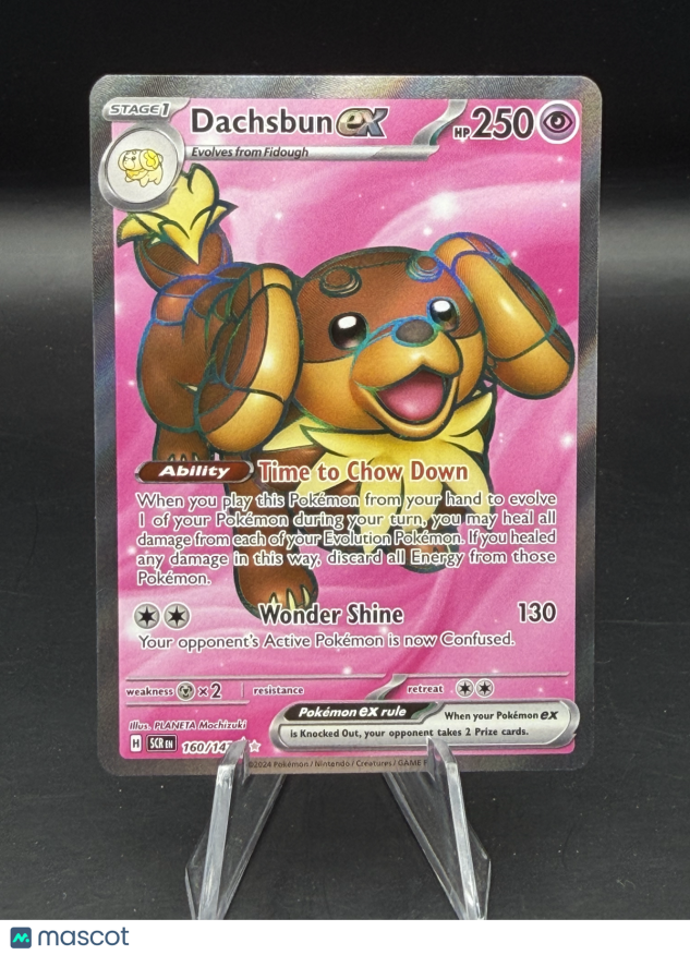 You are purchasing a Pokemon 2024 Stellar Crown Dachsbun EX Double Rare #160/142 - Near Mint or Better. You will receive the exact item in the photographs. Thank you for looking.(Cards with multiple quantities under $20 each, will be the same condition, but not necessarily the exact same copy of the card.)