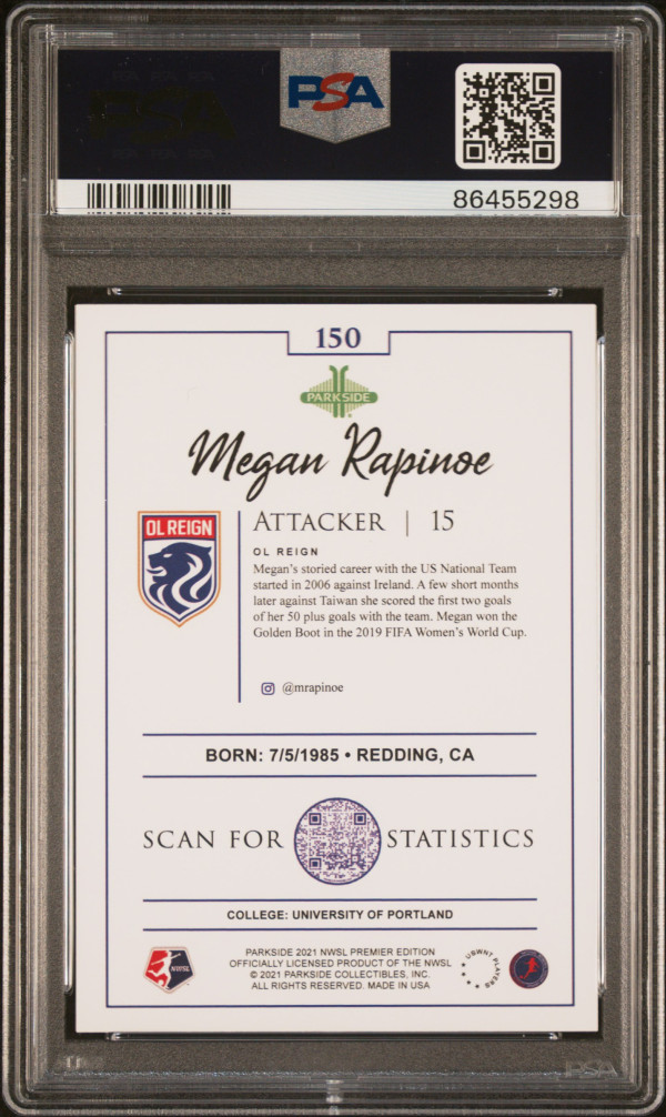You are purchasing a 2021 Parkside Nwsl Premier Edition Black and White Megan Rapinoe #150 PSA 10. You will receive the exact card in the photographs. Thank you for looking.