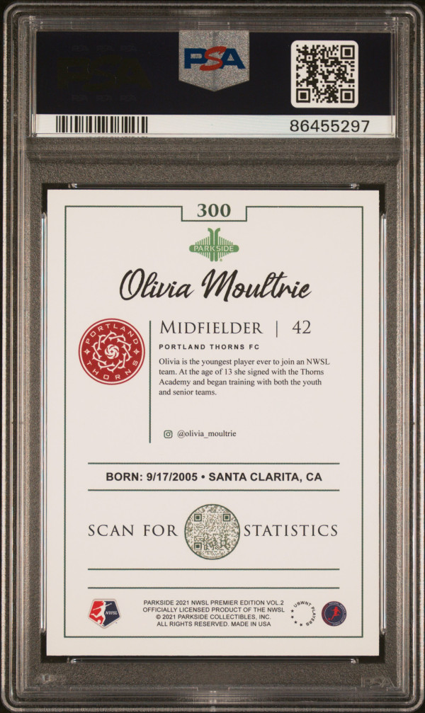 You are purchasing a 2021 Parkside Nwsl Premier Edition Olivia Moultrie #300 Rookie Base Set PSA 9. You will receive the exact item in the photographs. Thank you for looking. Listed with Mascot.