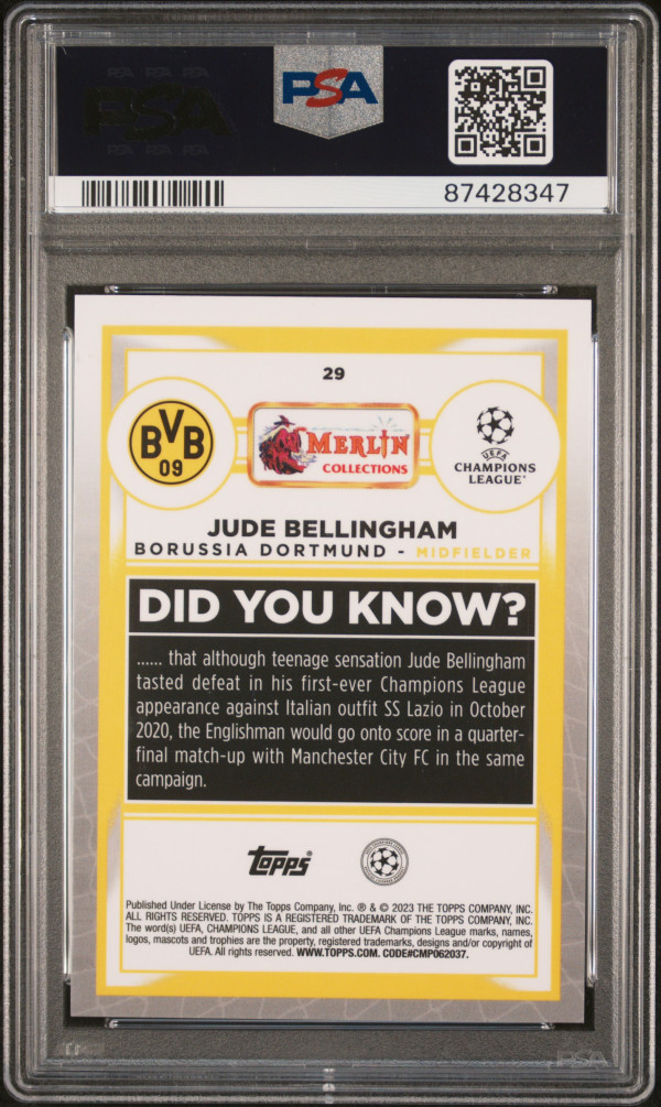 You are purchasing a 2022-23 Topps Merlin Chrome UEFA Club Competitions Jude Bellingham #29 Red Refractor 03/10 PSA 8. You will receive the exact item in the photographs. Thank you for looking.