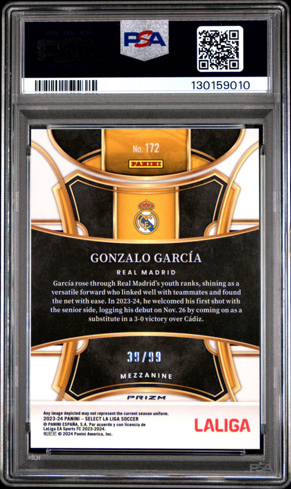 You are purchasing a 2023-24 Panini Select La Liga Gonzalo Garcia #172 Winter Camo /99 PSA 9. You will receive the exact item in the photographs. Thank you for looking.