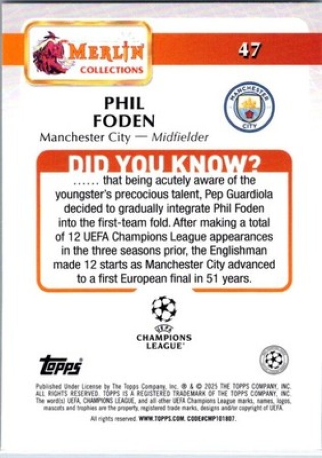 This is a nice example of a 2024-25 Merlin UEFA Club Competitions #47 Phil Foden
