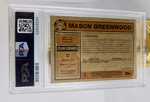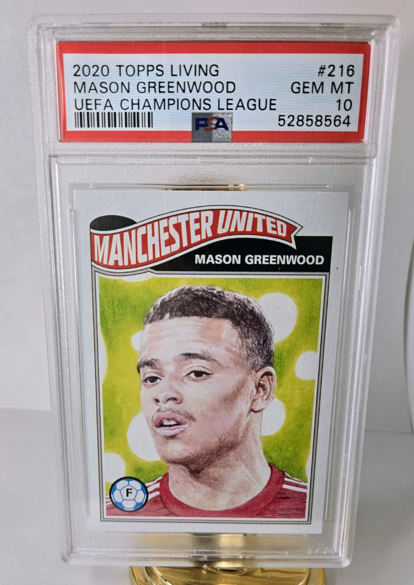The product is a Mason Greenwood trading card from the 2020 Topps UCL Living UEFA Champions League set. This soccer card features the Manchester United FC player in the Premier League. The card is part of a base set with a limited print run of 12,809, manufactured by Topps. It is a highly sought-after item for fans and collectors of sports trading cards, especially those interested in the UEFA Champions League.