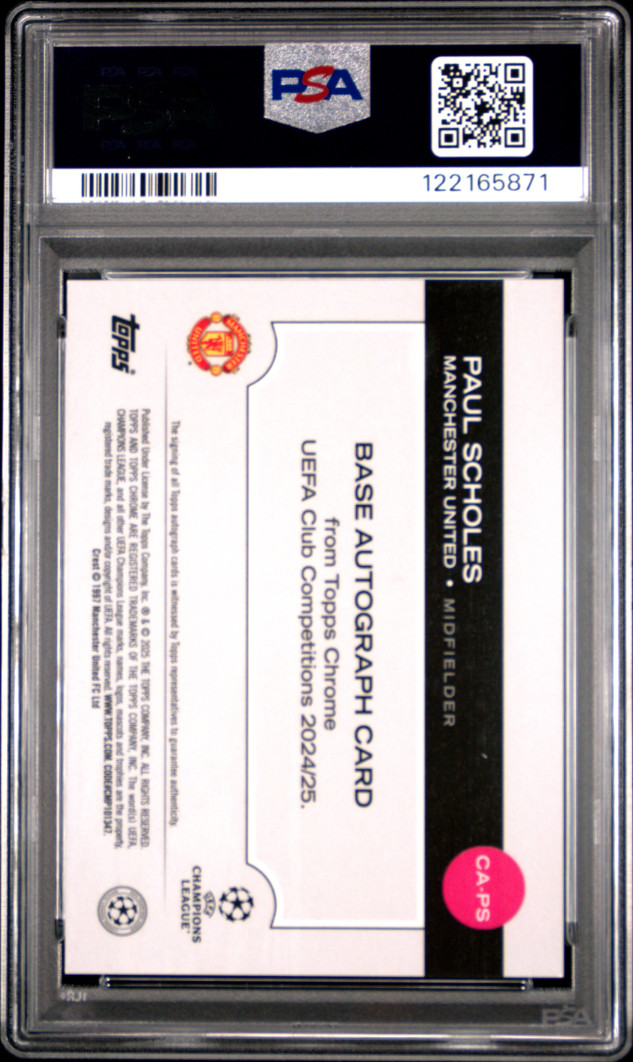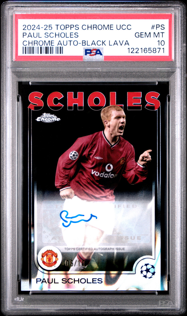 The product is a highly coveted and rare 2024-25 Topps Chrome UEFA Champions League trading card featuring an autograph from Manchester United legend Paul Scholes. This limited edition card is numbered #CA-PS and has been authenticated by Topps as a PSA 10, making it a perfect addition to any football fan's collection. Made of high-quality card stock with a thickness of 35 Pt., this card showcases a black lava parallel variety and includes exclusive features such as a label or sticker autograph, hologram, and being part of the base set. A must-have for collectors of sports trading cards.