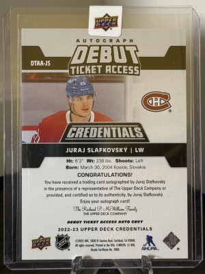 2022-23 Credentials Juraj Slafkovsky Debut Ticket Access Auto Grey /99