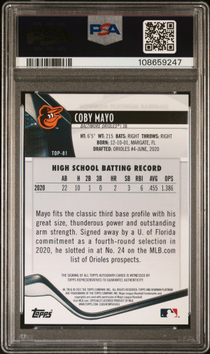 Bowman Platinum 2021 Coby Mayo AUTO Holo Foil #TOP-81 MINT #2 Orioles Prospect