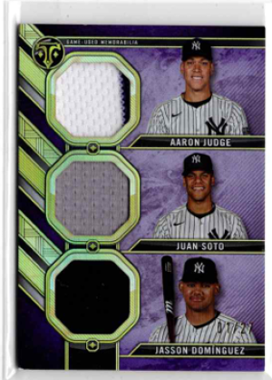 Aaron Judge, Juan Soto, Jasson Dominguez 2024 Topps Triple Thread Game Used Mem /27 (First on print)