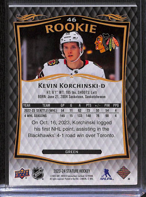 2023-24 Upper Deck Stature Hockey Kevin Korchinski #46 Green 348/375 RC