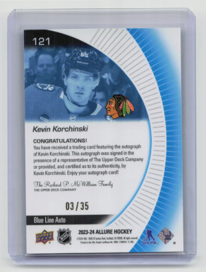 2023-24 Upper Deck Allure Kevin Korchinski #121 Blue Line Auto Rookie 03/35