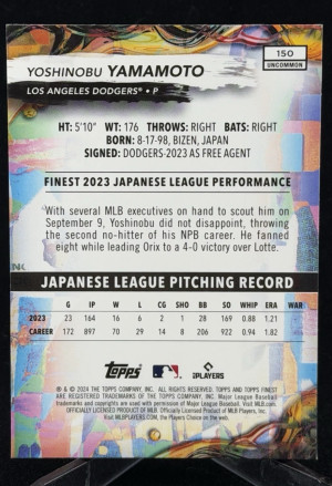 2024 Finest Yoshinobu Yamamoto RC Rookie #150 Dodgers
