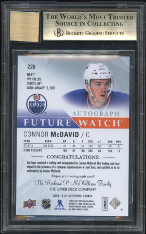2015 SP Authentic Future Watch Auto Connor McDavid #226 BGS 9.5/10 Auto 398/999 Rookie Card