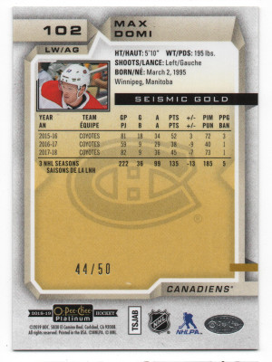 2018-19 O-Pee-Chee Platinum Seismic Gold Parallel #102 Max Domi /50