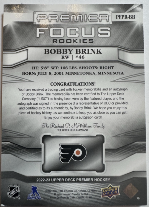 2022-23 Upper Deck Premier Bobby Brink RC GOLD Premier Focus Patch Auto /49