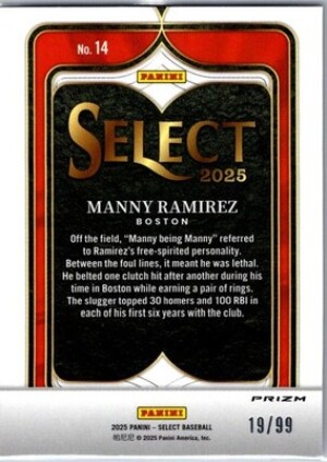 2025 Panini Select #14 Manny Ramirez Select Numbers Red Prizm #/99