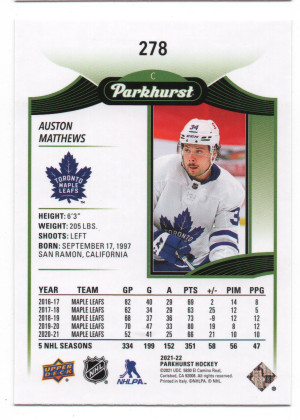 2021-22 Upper Deck Parkhurst ePack Gold Lite FX Parallel #278 Auston Matthews
