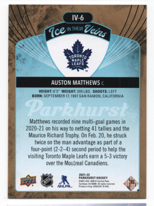 2021-22 Upper Deck Parkhurst Ice in Their Veins ePack Gold Parallel #IV-6 Auston Matthews
