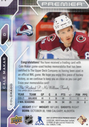 2021-22 Upper Deck Premier #14 Cale Makar Jersey - Colorado Avalanche