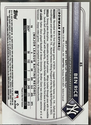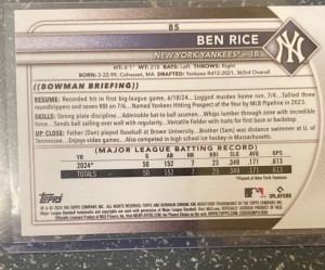 2025 Bowman Ben Rice #85 (RC) Rainbow Foil Refractor New York Yankees