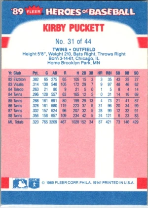 1989 Fleer Heroes of Baseball #31 Kirby Puckett
