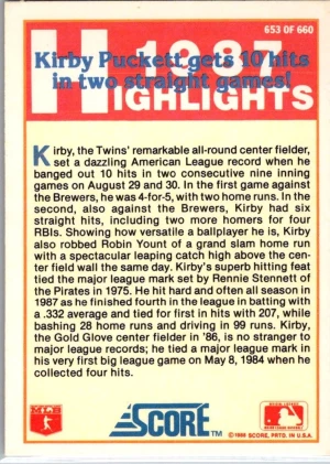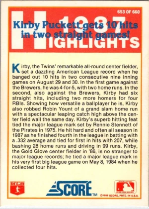 1988 Score #653 Kirby Puckett