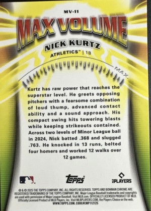 2025 Bowman Chrome Baseball Nick Kurtz Max Volume RC #MV-11 Athletics