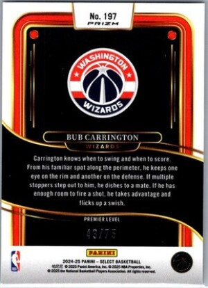 24-25 Select Bub Carrington Rookie Patch 34/99!! Wizards