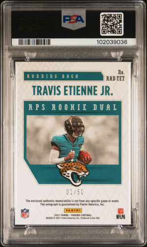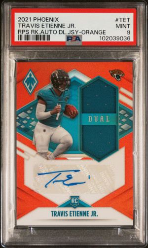 2021 PHOENIX ROOKIE DUAL PATCH AUTOGRAPH ORANGE #TET TRAVIS ETIENNE JR. RC (01/50) PSA 9