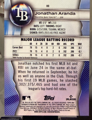2023 Bowman Platinum Jonathan Aranda #80 Ice Pattern Foil (RC)