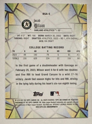 Jacob Wilson 2023 Bowman Draft Bowman Glass #BGA-5 Oakland Athletics Rookie Rc