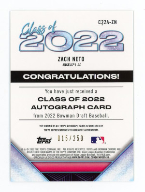 2022 Bowman Chrome ZACH NETO Rookie Card RC REFRACTOR AUTO AUTOGRAPH #/250 SP