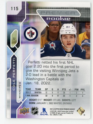 2021-22 Upper Deck Premier #115 Cole Perfetti Rookie Card /399