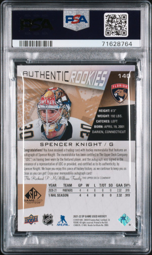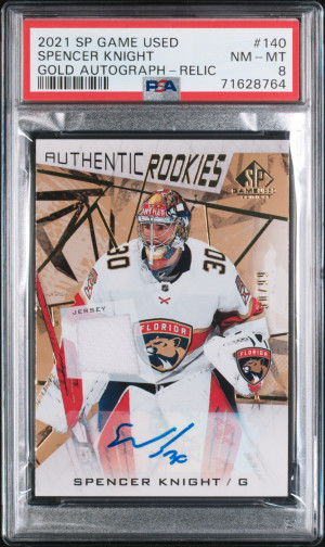 2021 SP Game Used Spencer Knight Gold Autograph-Relic PSA 8 NM-MT Jersey Numbered 30/99