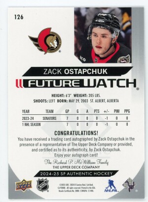 Zack Ostapchuk 2024-25 SP Authentic Future Watch Autograph Rookie /999 #126