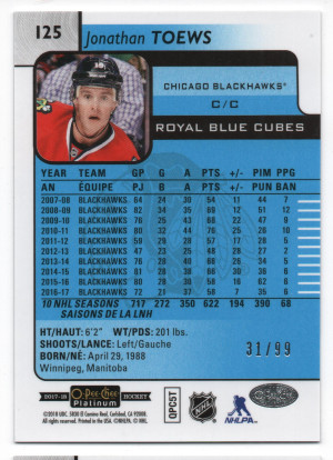 2017-18 O-Pee-Chee Platinum Royal Blue Cubes Parallel #125 Jonathan Toews /99
