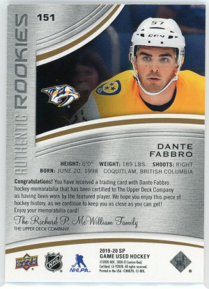 2019-20 SP Game Used #151 Dante Fabbro Rookie Jersey Gold /599