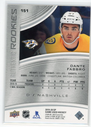 2019-20 SP Game Used #151 Dante Fabbro Rookie Rainbow /298