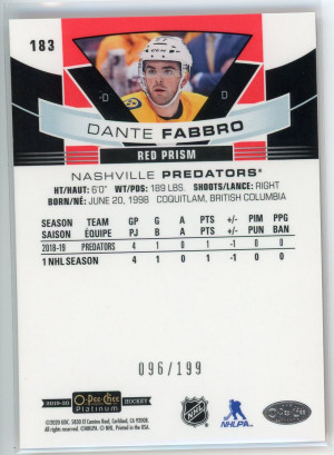 2019-20 O-Pee-Chee Platinum #183 Dante Fabbro Rookie Red Prism /199