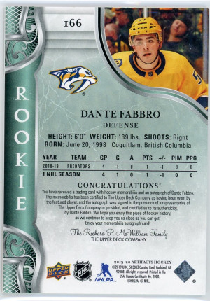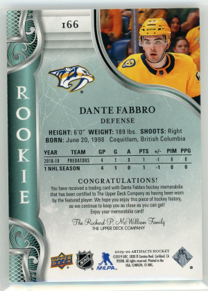 2019-20 Artifacts #166 Dante Fabbro Rookie Jersey /199