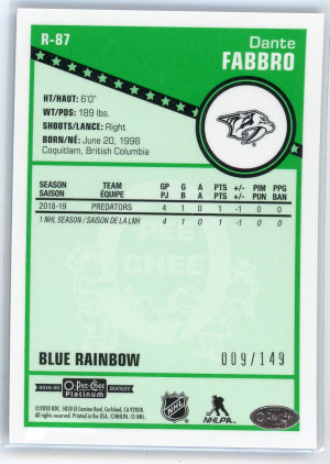 2019-20 O-Pee-Chee Platinum #R-87 Dante Fabbro Rookie Blue Rainbow /149