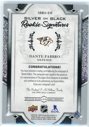 2019-20 Black Diamond Dante Fabbro Silver on Black Rookie Signatures /249