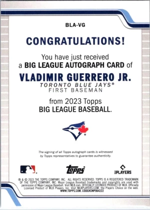 2023 Topps Big League #BLA-VG Vladimir Guerrero Jr. Orange Foil Autos #/25