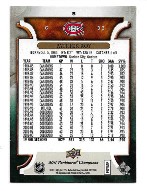 2011-12 Parkhurst Champions #5 Patrick Roy - Montreal Canadiens