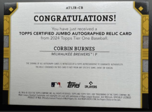 2024 Topps Tier One #AT1JR-CB Corbin Burnes Patch Relic Auto /10 Brewers Orioles