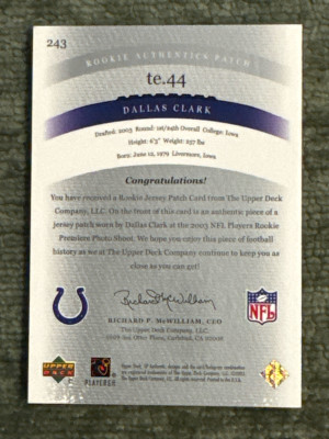 2003 Sp Authentic Dallas Clark Rookie Patch /850 Player Worn