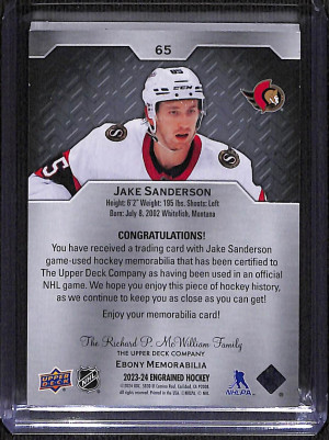 2023-24 Upper Deck Engrained Hockey Jake Sanderson #65 Ebony Memorabilia 03/25