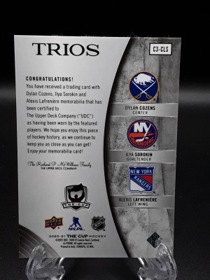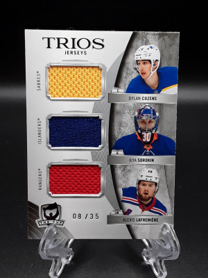 2020-21 UD The Cup Trios Jerseys Dylan Cozens Ilya Sorokin Alexis Lafreniere #'d 8/35