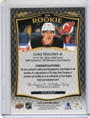 2023 UD Stature Luke Hughes Rookie Auto Green SP 106/199 Devils RC #34