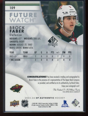 2023-24 SP AUTHENTIC HOCKEY - BROCK FABER #109 AUTOGRAPHED FUTURE WATCH AUTOGRAPH /999 THE TRUE ON CARD ROOKIE MN WILD FWA
