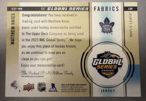 Matthew Knies, 2024-25 SP Game Used, Fabrics, Jersey, Global Series Sweden