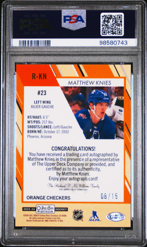 23/24 OPC PLATINUM ORANGE CHECKERS AUTOGRAPH #R-KN MATTHEW KNIES RC (08/15) PSA 9